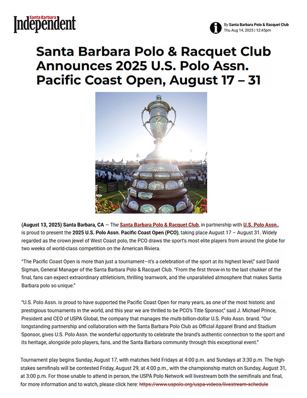(August 13, 2025) Santa Barbara, CA — The Santa Barbara Polo & Racquet Club, in partnership with U.S. Polo Assn., is proud to present the 2025 U.S. Polo Assn. Pacific Coast Open (PCO), taking place August 17 – August 31. Widely regarded as the crown jewel of West Coast polo, the PCO draws the sport’s most elite players from around the globe for two weeks of world-class competition on the American Riviera.